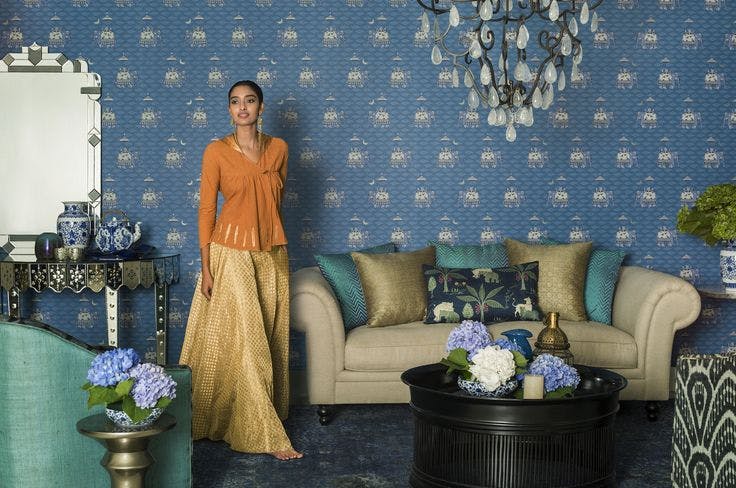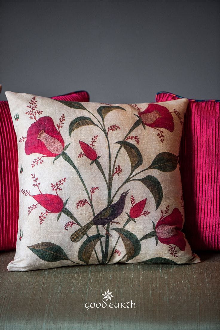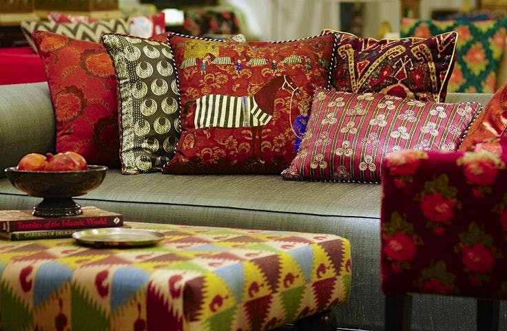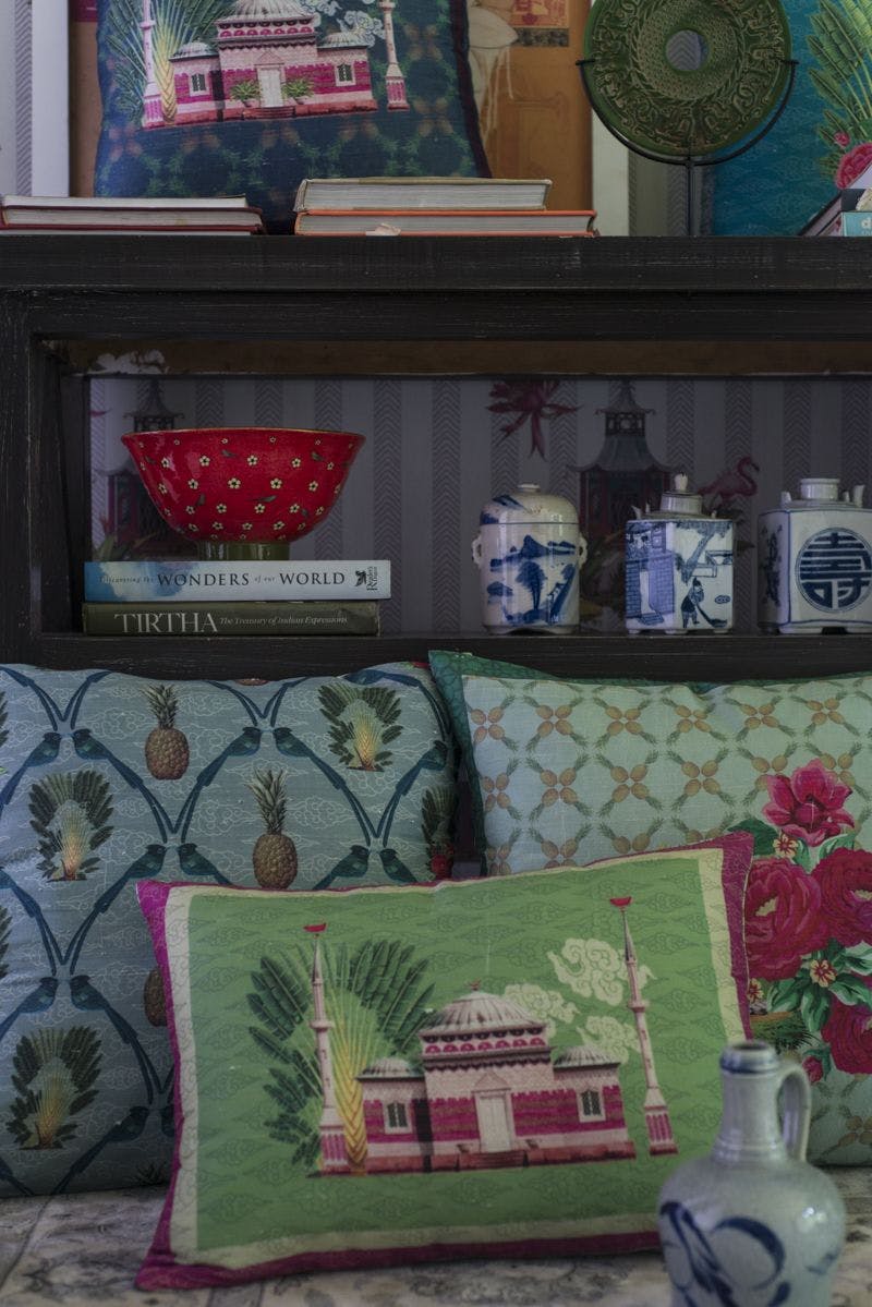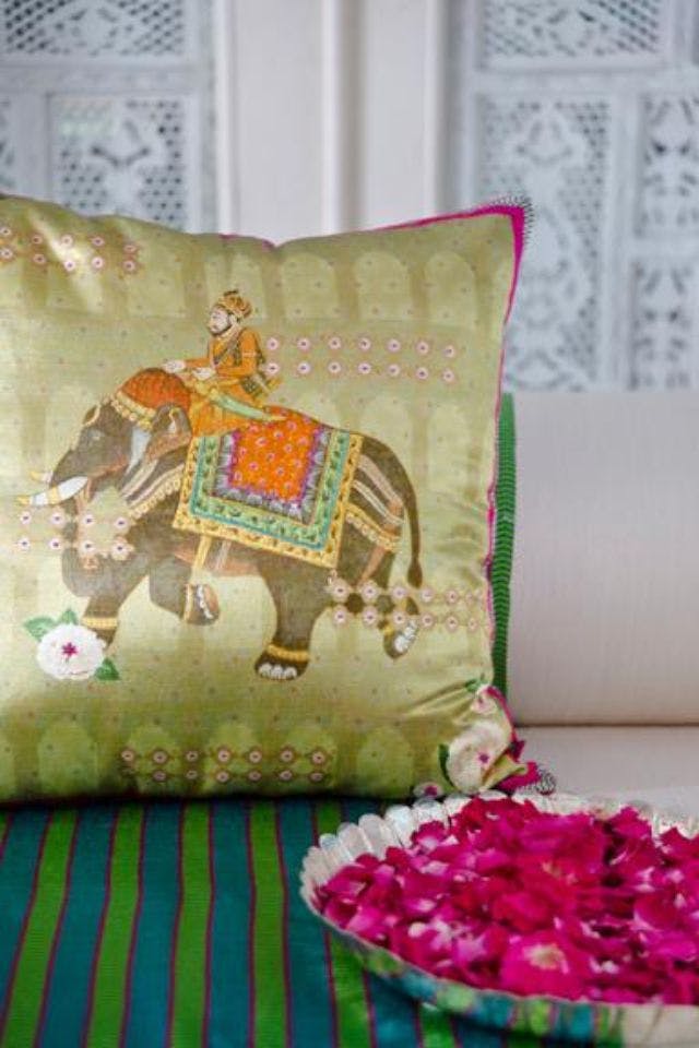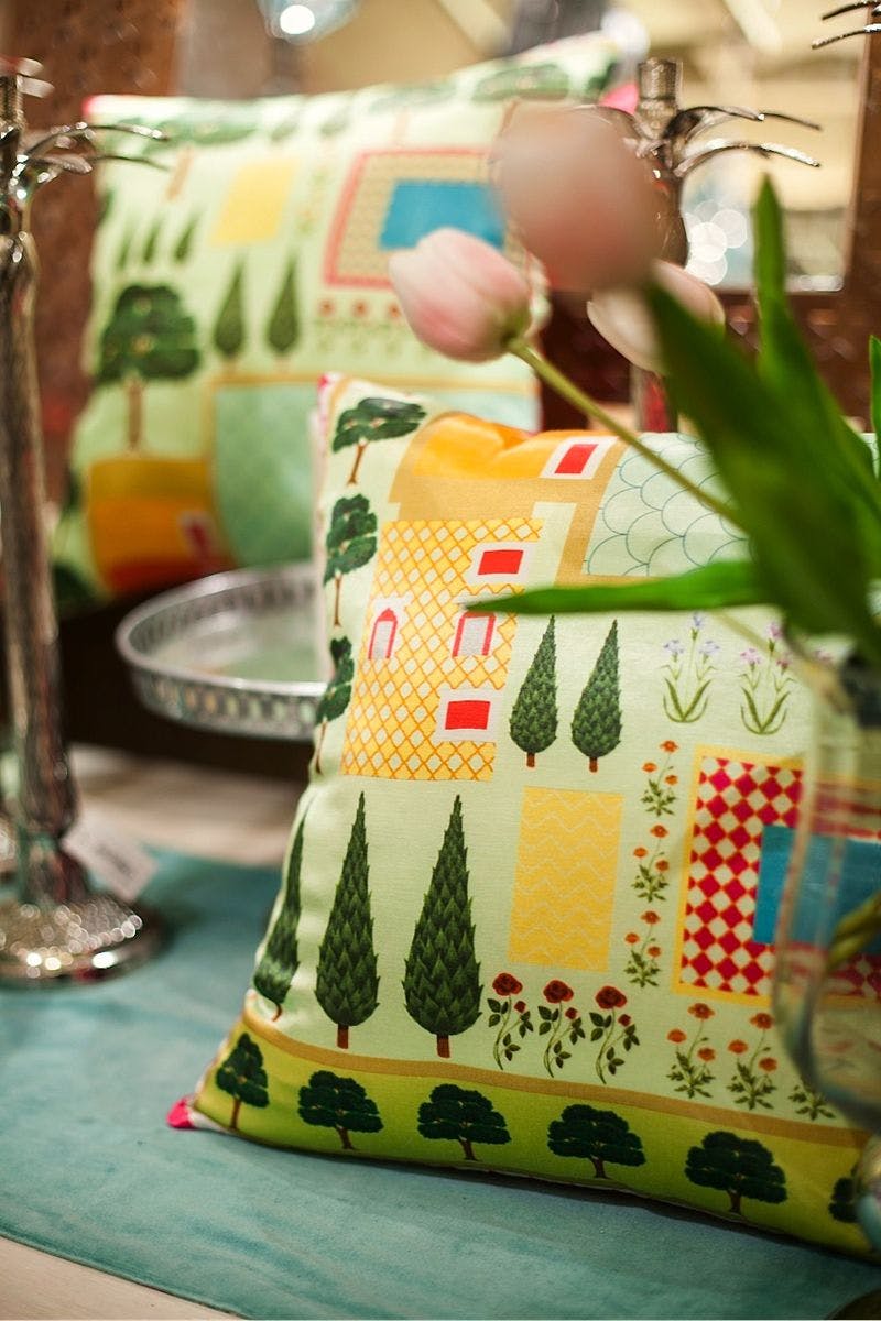 Every season at Good Earth, Pavitra designed textiles inspired by the theme of the year. These took the form of cushions with digital and block prints that extended the design narrative, while making a statement all their own. Delightful, quirky and filled with character, these motifs made natural conversation pieces. One of Pavitra’s earliest creations, titled ‘Retro Raja’ and featuring a very stylish turbaned man on jewel-toned silk, became an instant best-seller and an iconic product for the brand.
