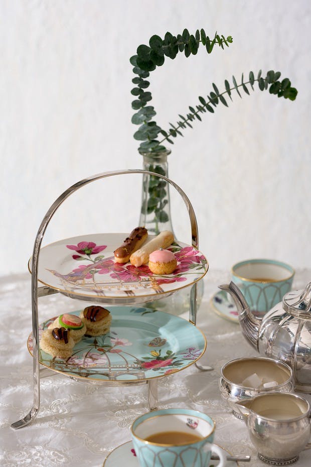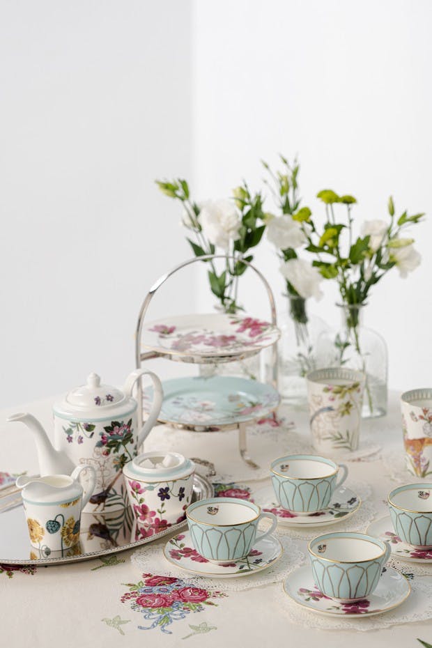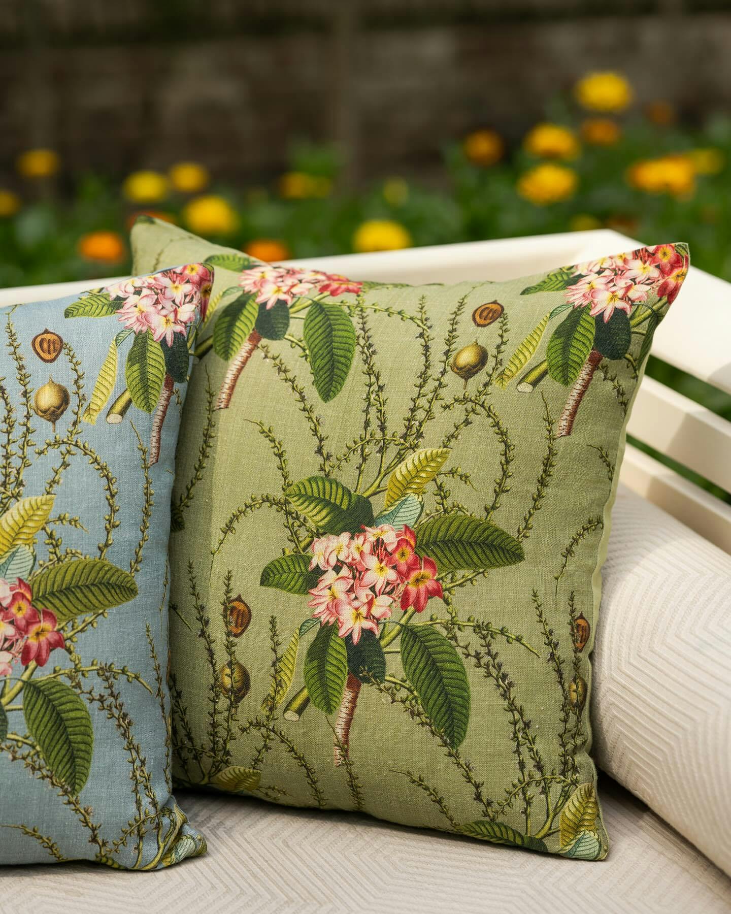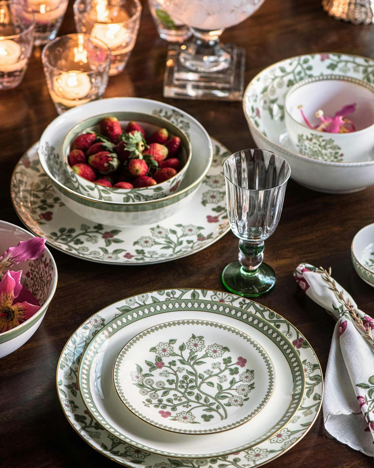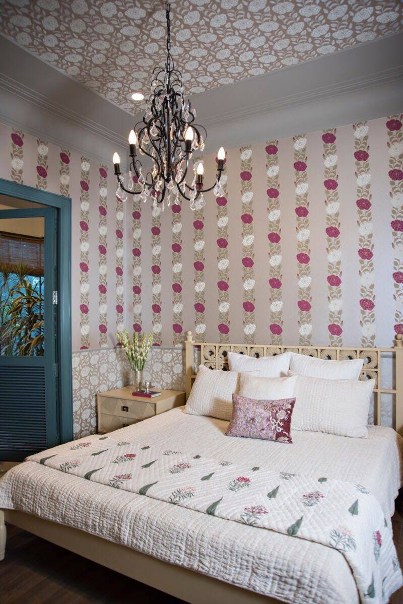 Conjures up a Himalayan countryside in summer, awash in creamy white blossoms, creepers of night-blooming jasmine and pink rosebuds nestled in mossy green foliage.