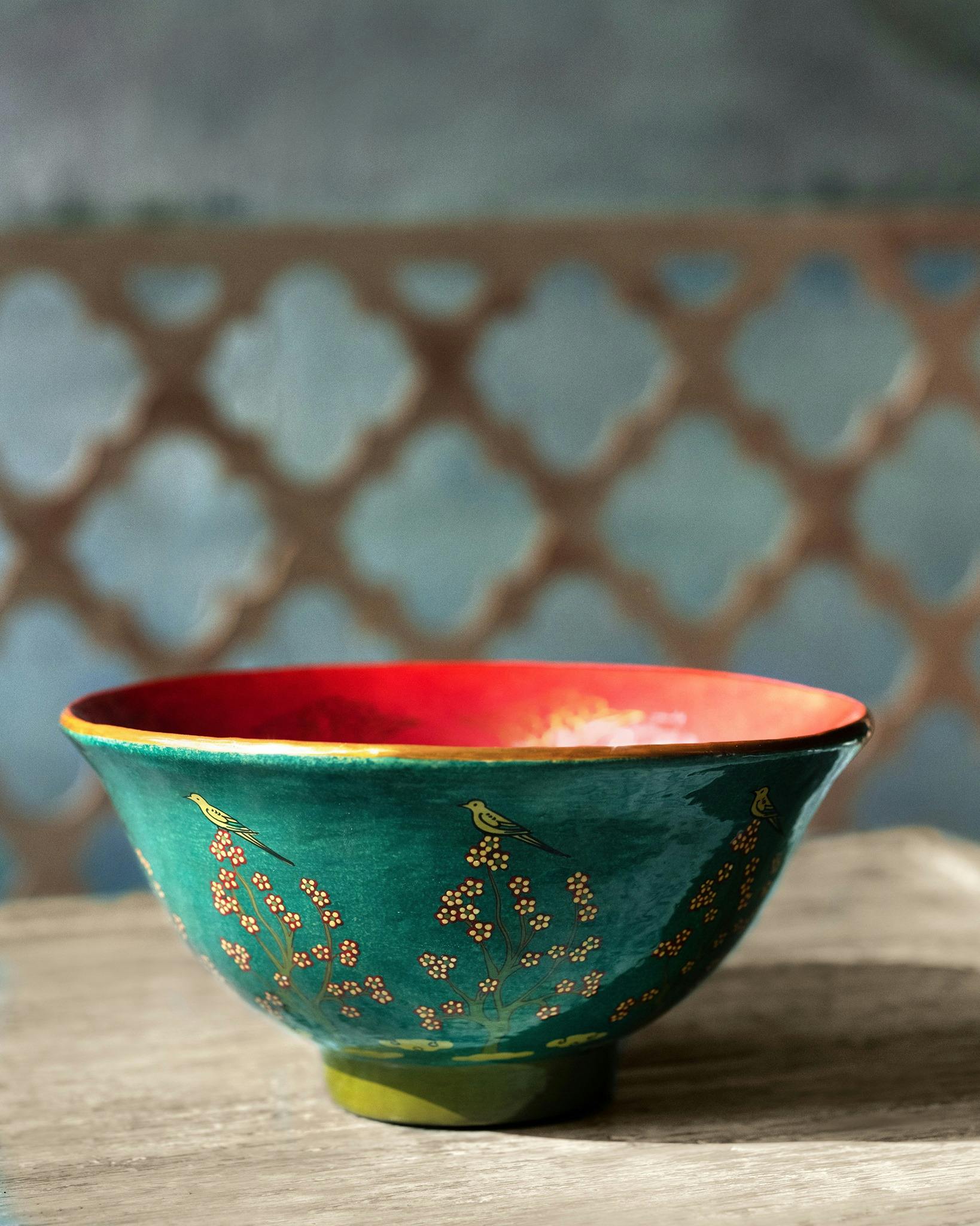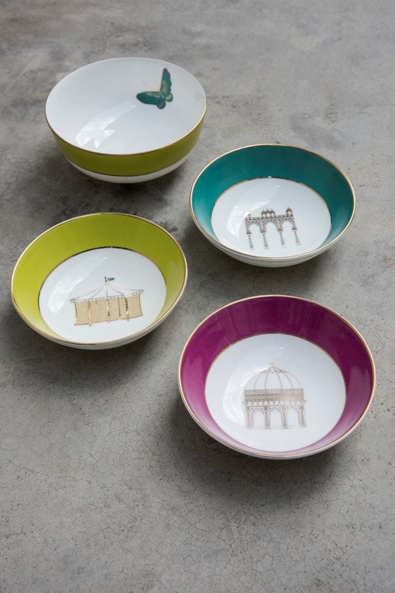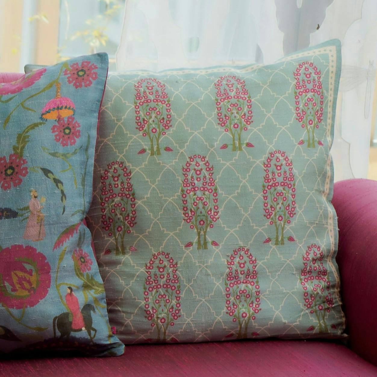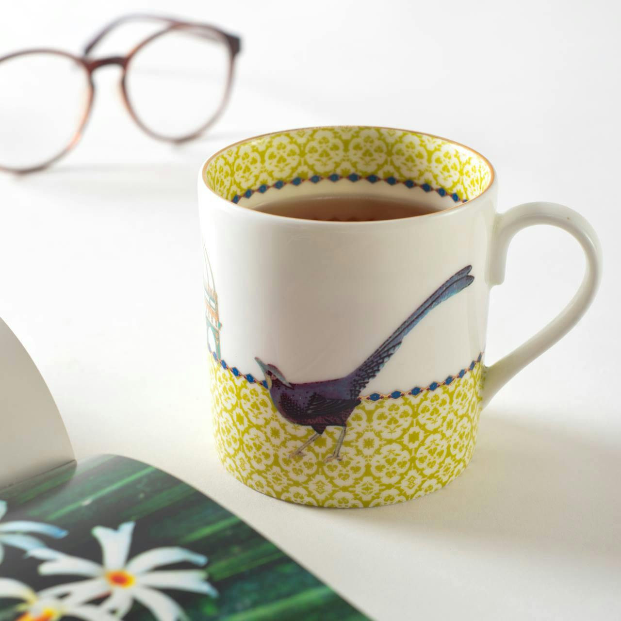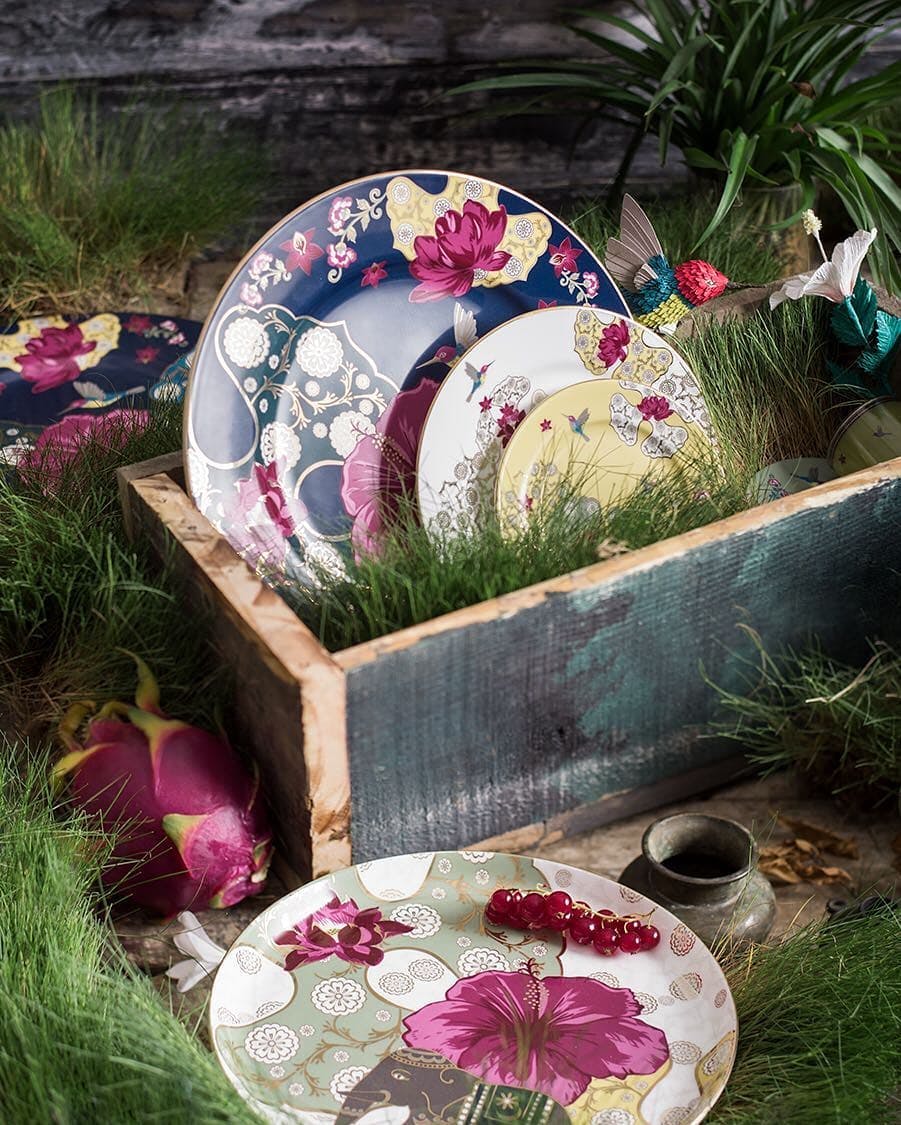 Channels the splendour of a Mughal garden with vivid motifs of birds, butterflies and stately pavilions, framed with delicate botanical art.