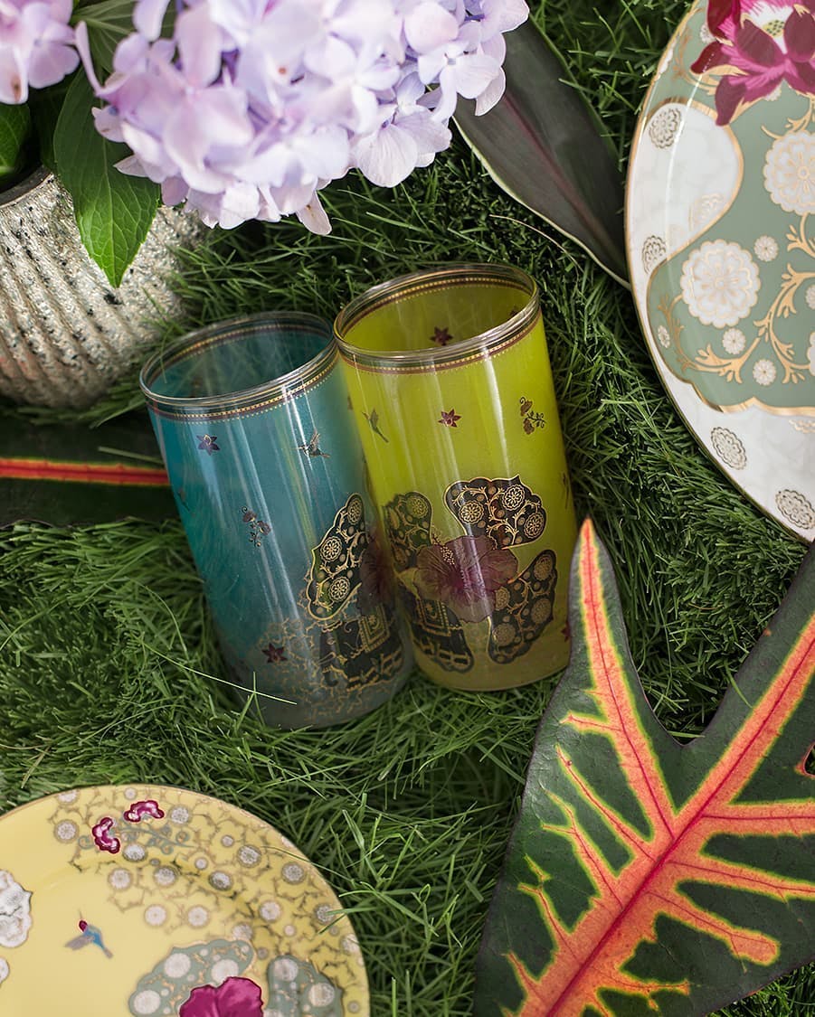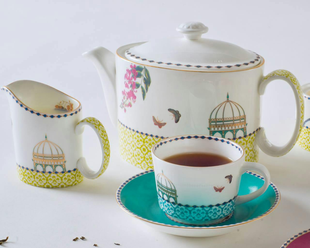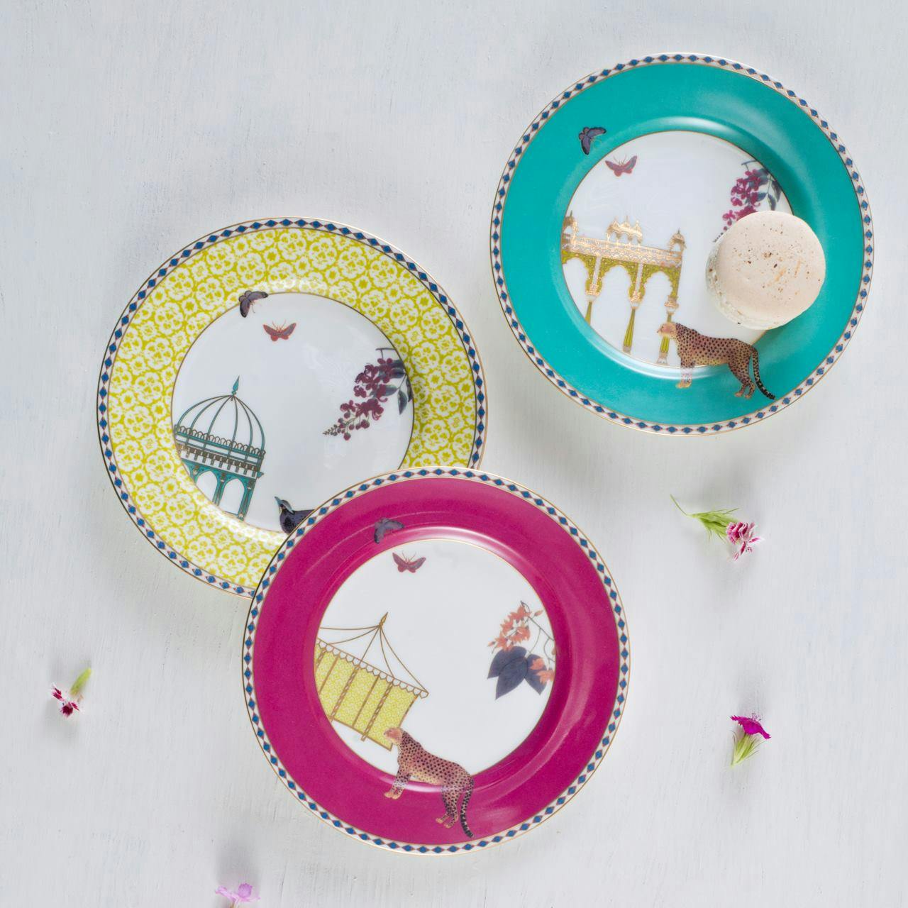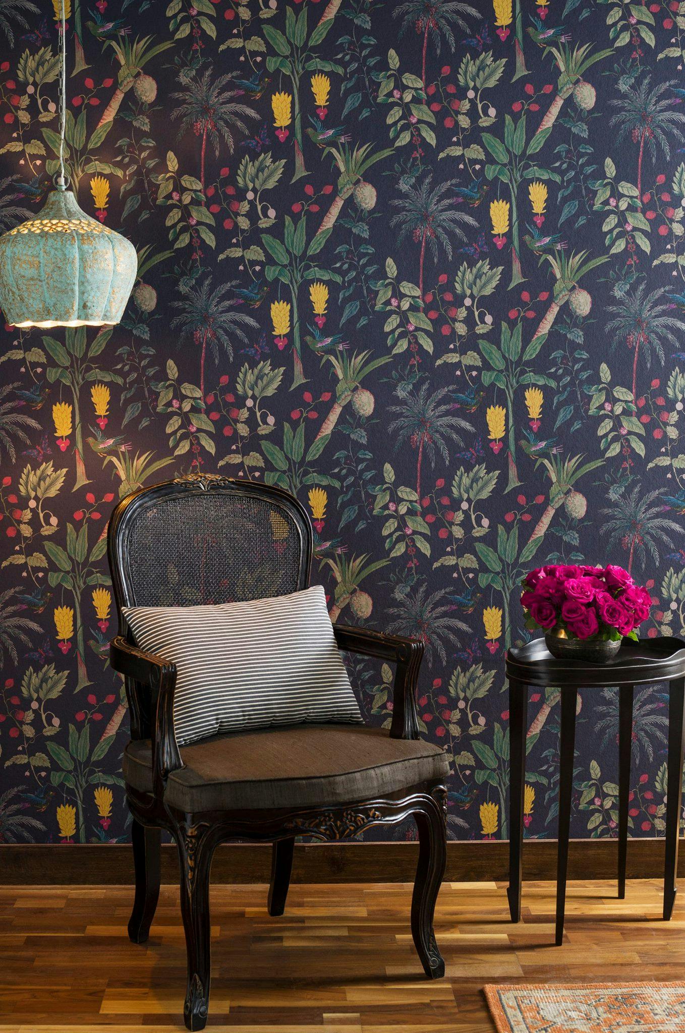 Channels the splendour of a Mughal garden with vivid motifs of birds, butterflies and stately pavilions, framed with delicate botanical art.