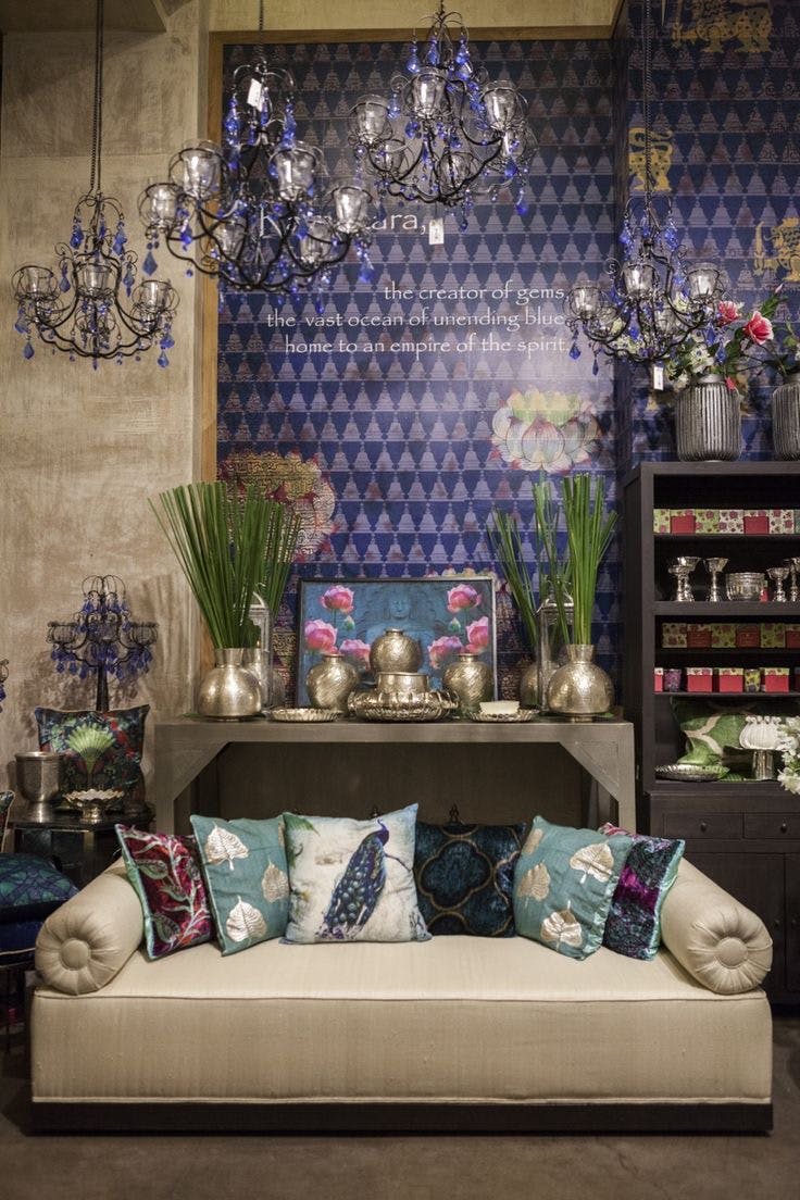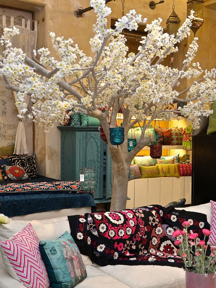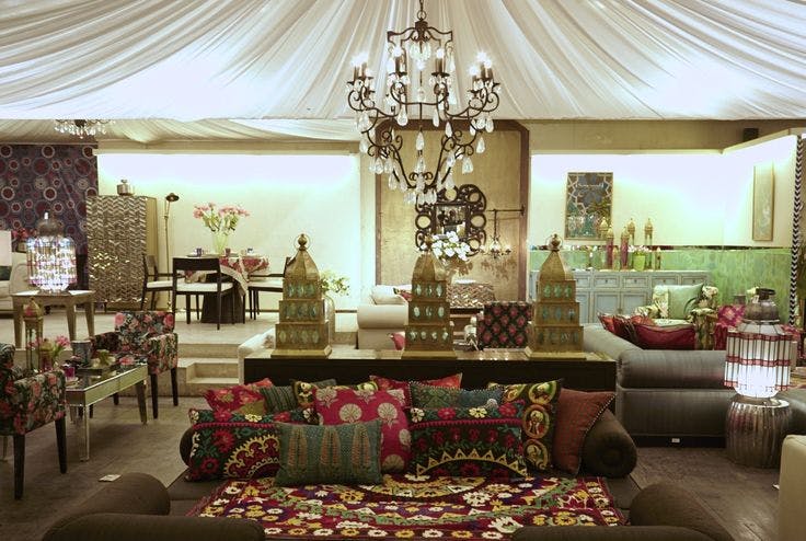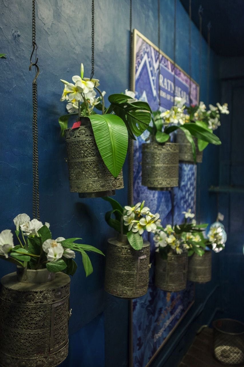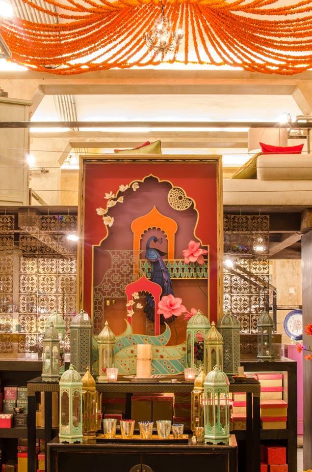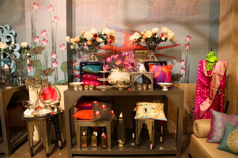 Shambala drew from India’s historical connections to the Far East and the cultures of the land once known as Indo-China. The palette was inspired by Chinoiserie art with one room entirely done in the classic white and blue, with accents of red and bunches of exotic flowers. The rest of the store wore the earthy tones of vintage woodcut engravings, with mulchy browns, stained plums and the occasional deep emerald. The leitmotif for the Shambala design story was a pair of flying yin-yang cranes—one made from paper, the other crafted from a plastic pipe.