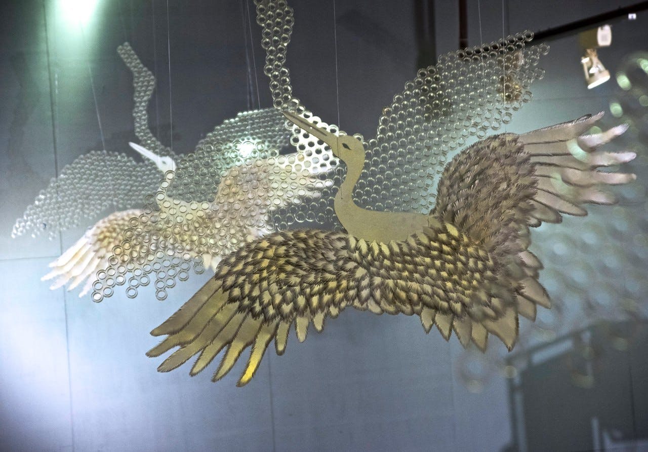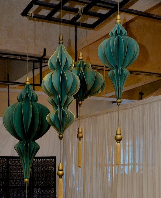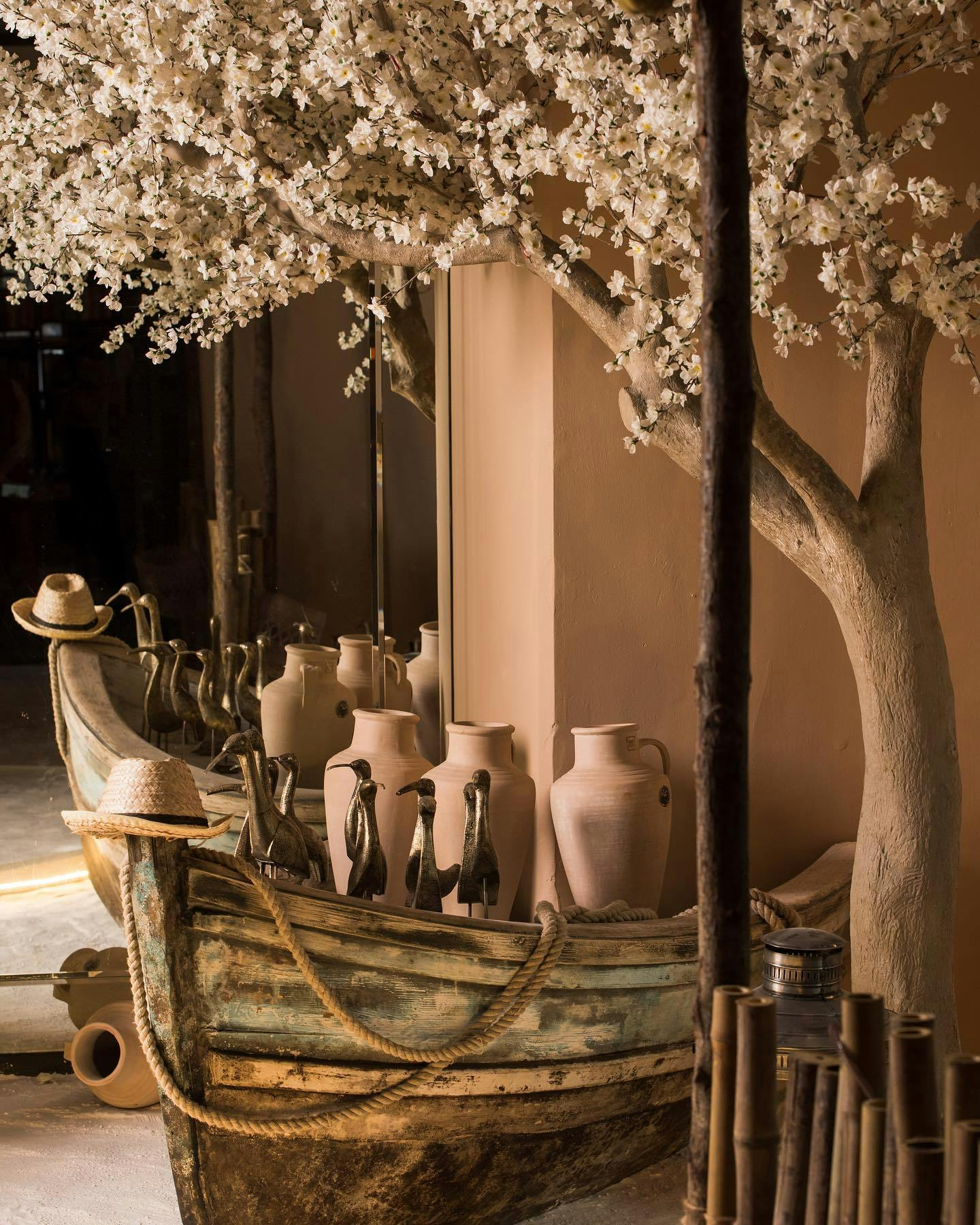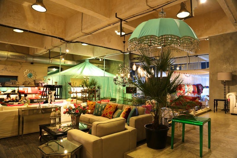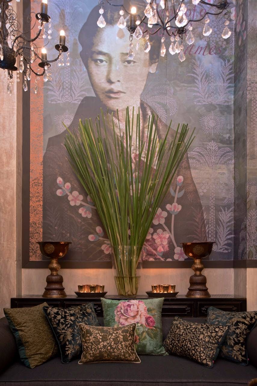 Shambala drew from India’s historical connections to the Far East and the cultures of the land once known as Indo-China. The palette was inspired by Chinoiserie art with one room entirely done in the classic white and blue, with accents of red and bunches of exotic flowers. The rest of the store wore the earthy tones of vintage woodcut engravings, with mulchy browns, stained plums and the occasional deep emerald. The leitmotif for the Shambala design story was a pair of flying yin-yang cranes—one made from paper, the other crafted from a plastic pipe.