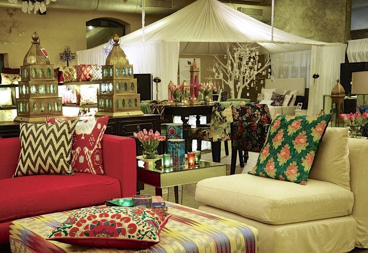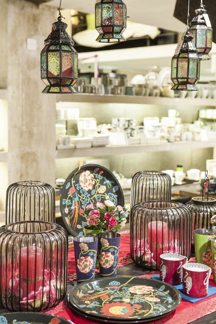 Night skies ablaze with a thousand stars and sunny courtyards filled with the brilliant colours of ikat. These magical scenes from a Good Earth design expedition to the historical Uzbek city were reimagined in-store for the Samarqand experience. Blocks of stunning ikat patterns on the wall stood out against a starry night-sky on the ceiling, scattered with billowing clouds of fabric.