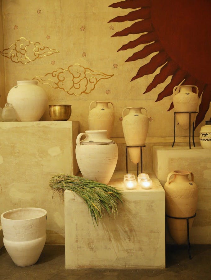 To recreate the transcendent beauty of Benares, the stores wore the colours of the Ganges as it reflected the sky at dusk and dawn: pale lavenders, soft roses and pink-oranges. The famous Benares ghats came to life through a hand-painted view of the skyline along the river, and steps conjured from terracotta-and-white bricks.