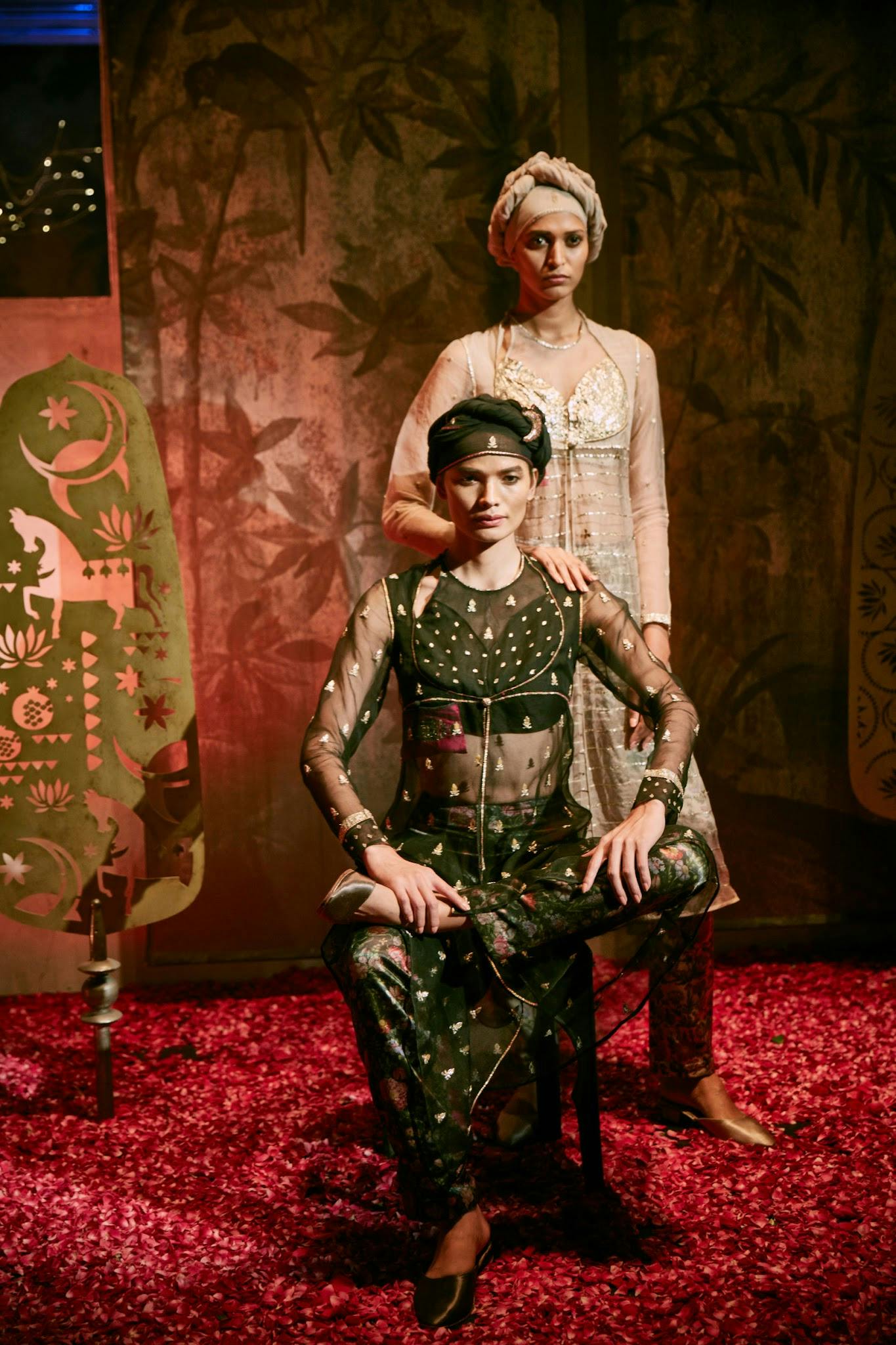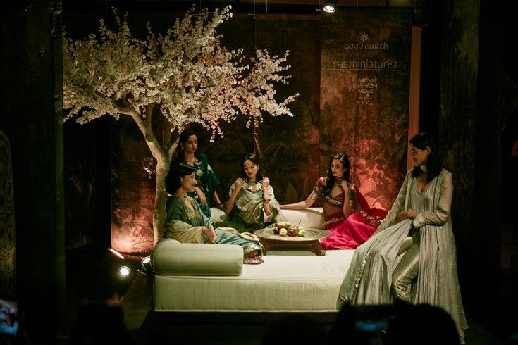 Good Earth’s first couture collection, Miniaturist, was presented at the Lakme Fashion Week Winter/Festive 2018 through a series of living tableaus staged at the store in Raghuvanshi Mills, Mumbai. To extend the brand’s legacy into the realm of fashion, Pavitra conceptualised these tableaus as set-pieces designed around the models and providing rich historical context to the exquisite textiles they wore. Each set-piece or space was conceived of as an ensemble in itself, layered with fragrance, live music and flickering lights to transport the audience to different eras of style.