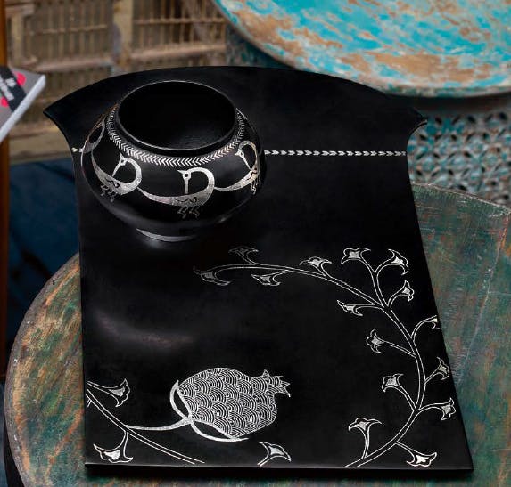 Over 20 years at Good Earth, Pavitra participated in many meaningful design interventions in traditional Indian crafts. One that she led was among the papier mâché artisans of Kashmir in 2012. Papier mâché has been practised by skilled artists in the Valley since the 15th Century, but in the contemporary market of the 21st Century, the art was underappreciated and sold mostly as touristy trinkets. During her visits to Kashmir, Pavitra saw that these under-priced souvenirs were however, painstakingly crafted by skilled hands in dark workshops. She worked with them to change the design language of the craft in a way that created more value for the craftspeople and the customer. The result was a line of larger-scale products, like trays, platters and bowls, with simpler, more narrative-led design. The papier mâché line, which sold for years through Good Earth, won an EDIDA award in 2013 and sparked a transformation in the way the craft was practised throughout the Valley.
