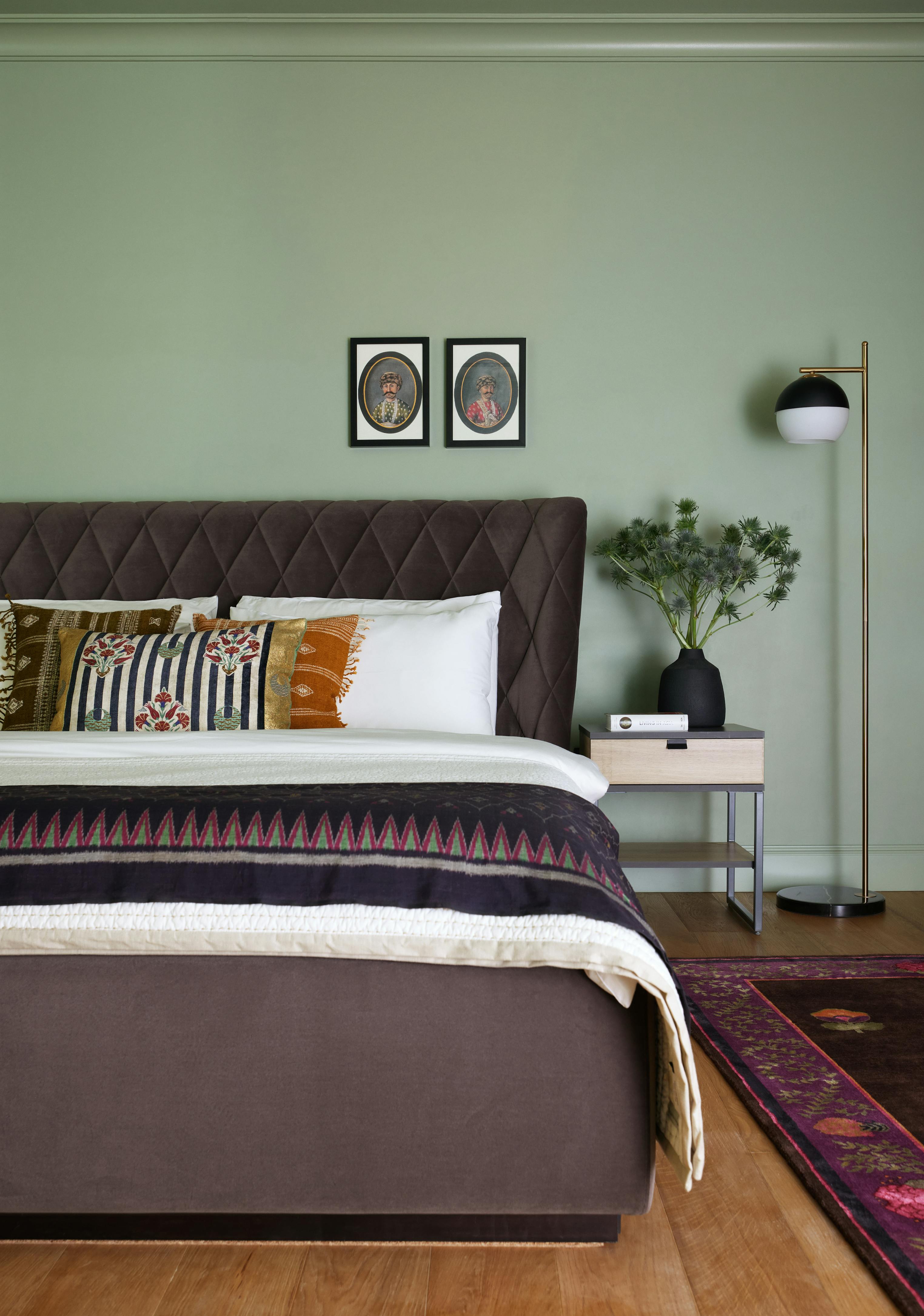 The avocado wall colour in the son's bedroom sets off the deep charcoal tones of the velvet headboard. The deep plum and mahogany of the Sipahi carpet from PRD x JR brings the space to life.